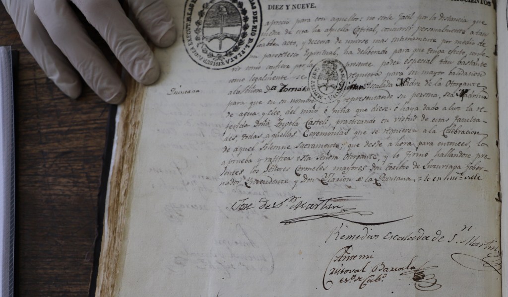 En el registro del escribano Cristóbal Barcala (Protocolo 176- 1818,fs.112), , se registra uno de los pocos documentos donde comparten firma Remedios de Escalada y José de San Martín. Fijate la firma del General, y detectarás la dolencia de su escritura.