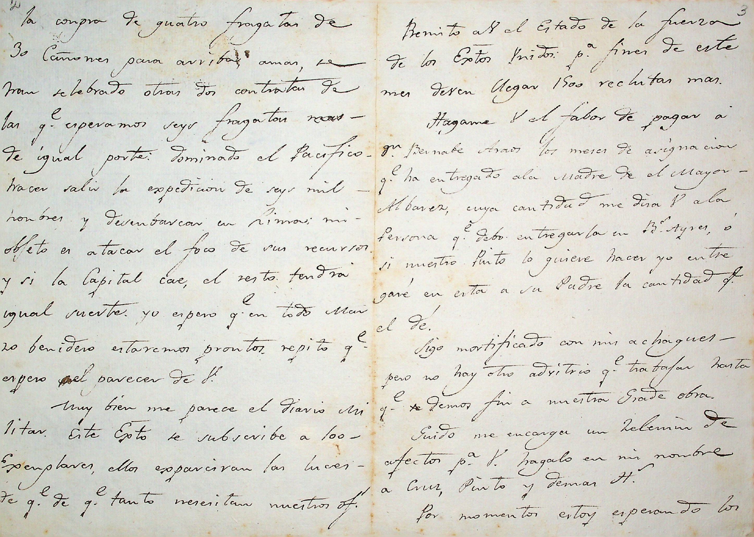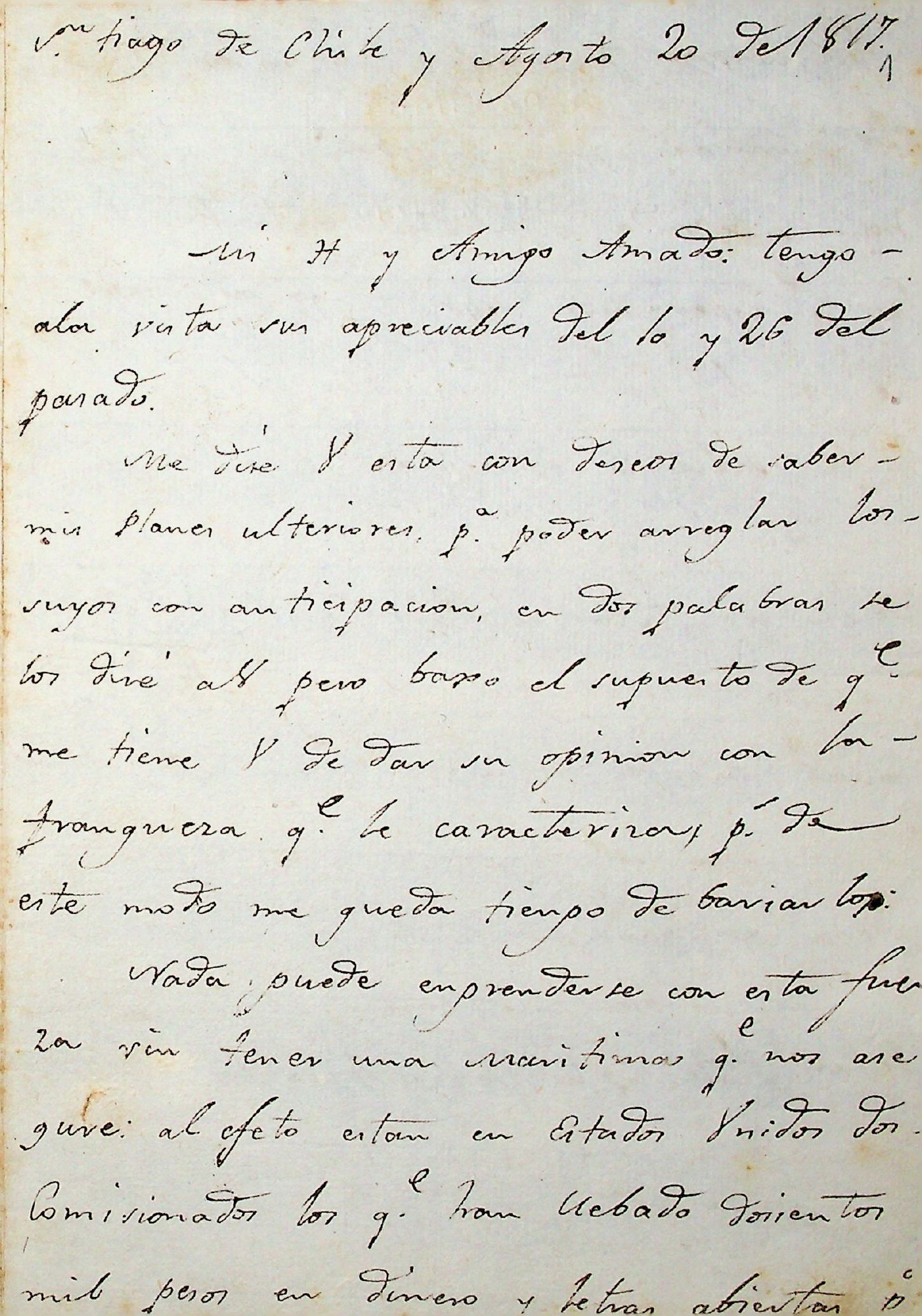 Carta del General en Jefe de los Ejércitos Unidos, Coronel Mayor José de San Martín, al General en Jefe del Ejército Auxiliar del Perú, Brigadier Manuel Belgrano, en la cual se ocupa de sus planes sobre el Perú y solicita la opinión de éste para variarlos si fuera necesario; se refiere a la compra de fragatas en Estados Unidos y al proyecto de Belgrano sobre la publicación de un diario militar, para el que suscribe al ejército con 100 ejemplares. Santiago de Chile, 20 de agosto de 1817.