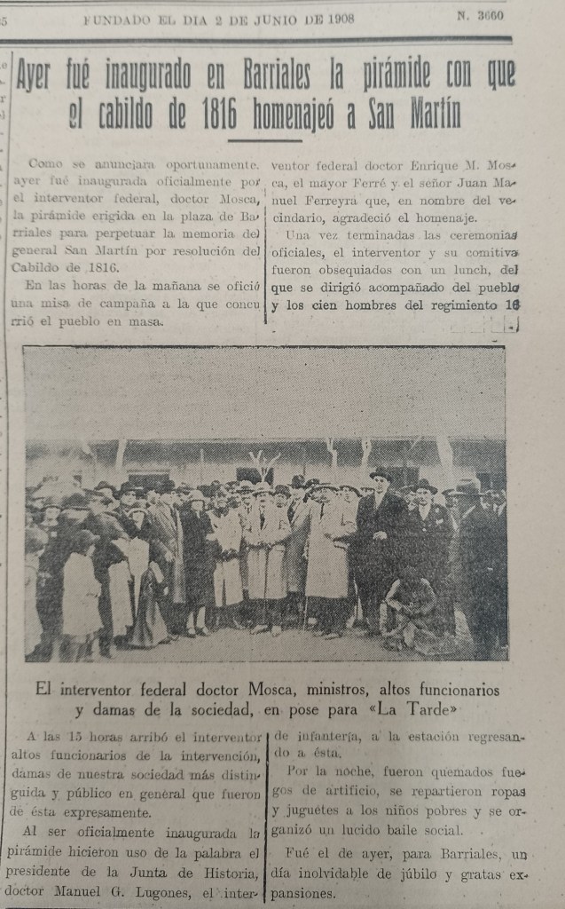 Hace un siglo, Barriales rindió Homenaje al Libertador: crónica de la inauguración de la Pirámide de San Martín en 1925