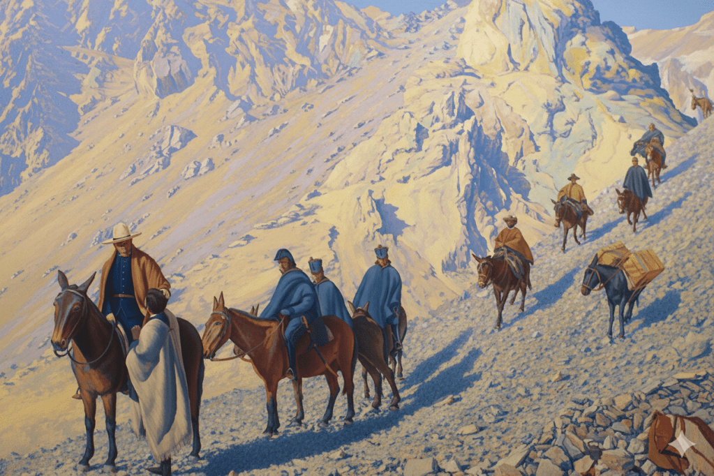 «Cabalgaba una hermosa mula zaina con silla de las llamadas húngaras, y encima un pellon, y los estribos liados con paño azul por el frío del metal. Un riquísimo guarapón (sombrero de ala grande) de paja de Guayaquil cubría aquella hermosa cabeza en que, había germinado la libertad de un mundo, y que con atrevido vuelo había trazado sus inmortales campañas y victorias. El chamal (poncho) chileno cubría aquel cuerpo de granito, endurecido en el vivac desde sus primeros años.Vestía un chaquetón y pantalón de paño azul, zapatones y polainas, y guantes de ante amarillos.